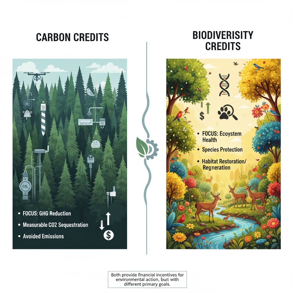 Unlike carbon credits, which are measured in tons of CO₂ reduced or removed, biodiversity credits focus on the health and resilience of ecosystems.